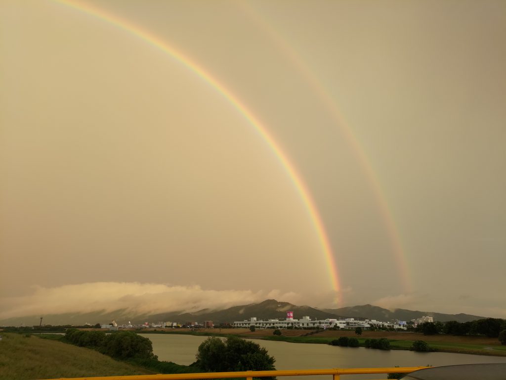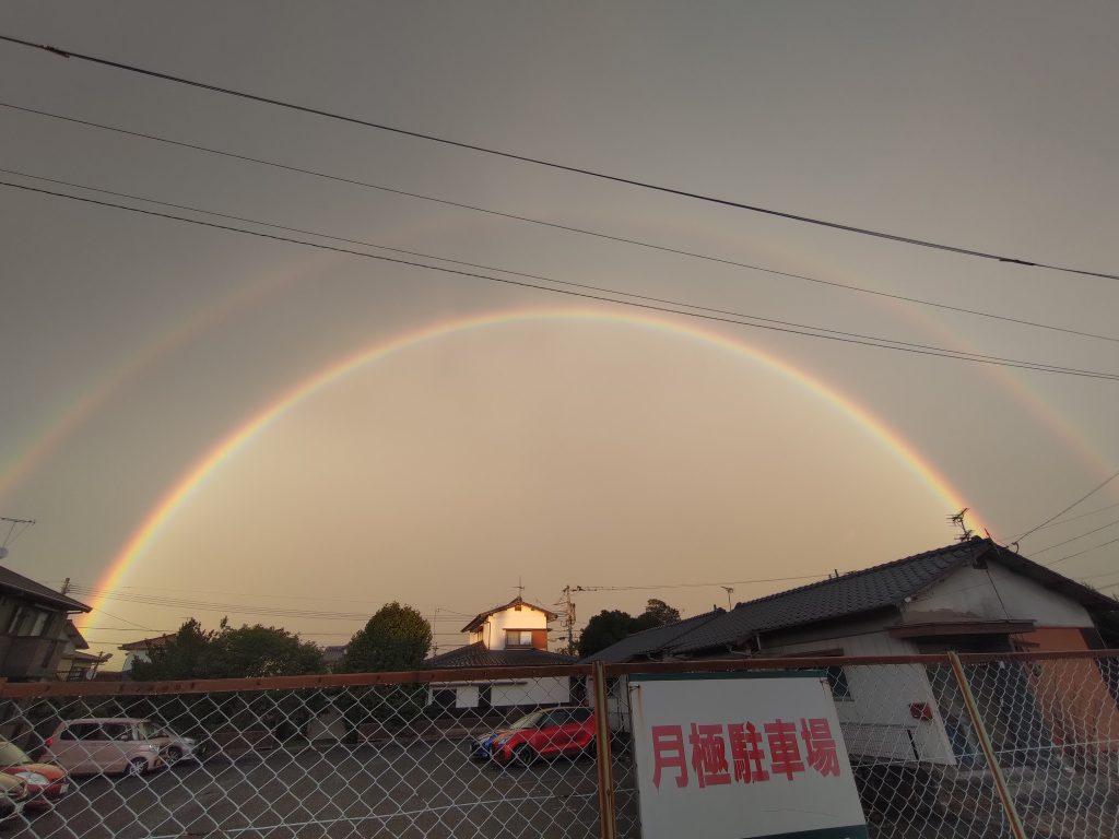 On my way home from the Kyushu factory, I happened to look up at the sky and saw a rainbow. There was a huge rainbow in the sky, and when I saw another rainbow outside of it, I was truly surprised. I got off my bicycle and stopped for a while, gazing at it slowly for about 5 to 10 minutes. I felt a little embarrassed standing there on the sidewalk, but strangely, I felt calm and happy. I felt very lucky to have been able to witness such a special moment with my own eyes.